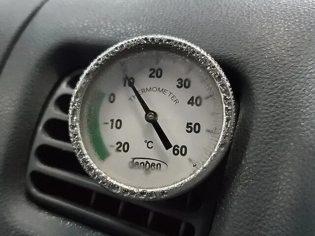 吹き出し口の温度は9℃でした(^^) 天気も悪いので結露してます。