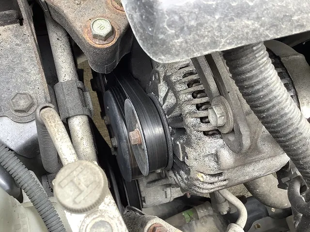 オルタネーターの廻りに付いた黒い粉はベルトの削りカスです。