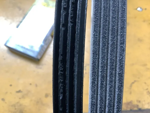 写真の左は摩耗したベルト右側は新品ファンベルトです。